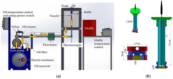 (a) Schematic representation of laboratory oil closed-loop for determination of the rate of heat removal during oil-quenching steel samples; (b) detailed view of the probe that holds a steel disc (marron color) and with sub-superficial thermocouple (black color). Dimensions are in mm.