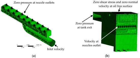The computational domain included only the space occupied by the oil inside the feeder and tank. This domain was divided into three subdomains: (1) the feeder, (2) the tank and (3) five virtual boxes at the five carousel positions where leaves are immersed. The reason for this is to improve the computer efficiency by solving each subdomain one at a time rather than the full domain in a single run. This approach is valid because the oil flows downstream. This supports the assumption that oil velocity profile at the exit of nozzles does not depend on the velocity pattern in the tank but depends only on the flowrate at the inlet cross section area of the tube feeder. Therefore, our first step was to solve for the fluid flow in the feeder by itself, whose boundary conditions and meshing are shown in Figure 5a. In a second step, the velocity profiles computed at the exit of the respective nozzles were imposed as an inlet boundary condition when solving the governing equations for the whole tank. During this step, the shaper table, the head of downholders and the leaf springs were absent except for simple flat plates that replaced them. The justification for this was to numerically capture the overall fluid flow in the tank by carefully considering the most evident flow resistance and free flow areas. Figure 5b shows the corresponding boundary conditions and meshing. To compute the fluid flow field at the neighborhood of leaf springs, a third subdomain was formed by five virtual boxes that contained the immersed springs together with the detailed geometry of the shaper table and downholders. The size of these boxes was chosen to include conveniently the leaf springs together with the shaping tools. This choice was also validated by showing that computed results were independent from box size. The computed velocity distribution from the tank solution was considered as a boundary condition for the faces that had a net positive inflow, whereas a zero reference pressure was considered a boundary condition for those faces that had a net outflow. Figure 5c indicates the corresponding boundary conditions and meshing. Notice that numerical meshing is active only on the subdomain that is being solved for, thus avoiding discretization of the solid bodies to save computer memory and time. Regarding the non-slip wall boundary condition, the adopted strategy with the normal dimensionless distance from the wall, y+, was to consider a hydrodynamically smooth wall with roughness height, Ks = 0, and default roughness constant Cs = 0.5 that had no effect in the computation. These coefficients are defined for the Law-of-the Wall Modified for Roughness [].