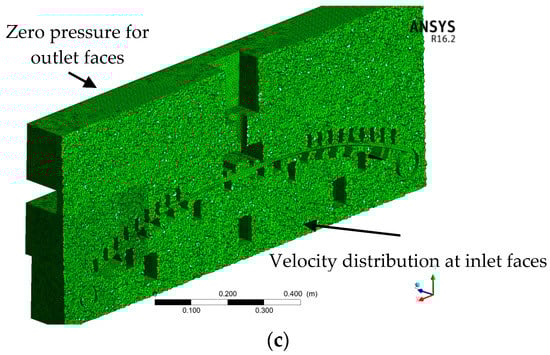 The governing equations were solved by the finite volume method [] implemented in the ANSYS FluentTM (version 16, ANSYS Inc., Canonsburg, PA, USA, 2015), code. Every subdomain was divided into several regions to reduce skewness, improving mesh quality. The underrelaxation factor was manually changed throughout the solution process to reduce the ‘scaled’ residuals for mass, momentum and turbulence equations [] to values that were less than 10−3.