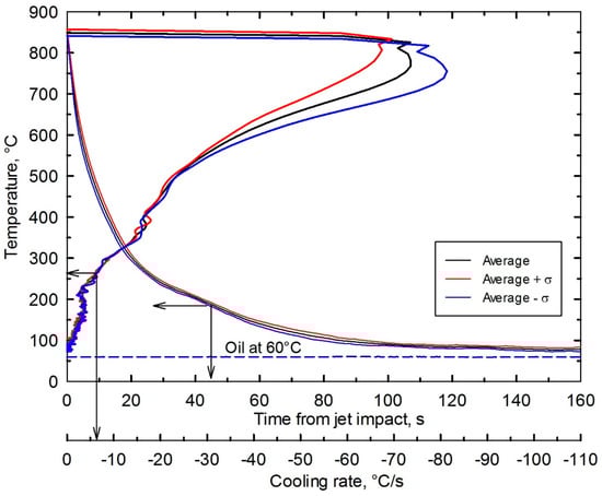 Average thermal evolution and its corresponding cooling rate obtained from oil-quenching laboratory experiments. Impact oil velocity and oil temperature were 0.9 m/s and 60 °C, respectively. A 95% confidence interval is indicated for both curves, temperature and cooling rate.