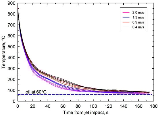 Figure 7 shows the effect of the jet impact velocity on the average temperature evolution determined from laboratory data. Similarly, to Figure 6, each curve includes its 95% confidence interval. It can be seen in Figure 7 that during the initial cooling period all curves are very close each other. However, these curves clearly separate each other at temperatures below ~350 °C where even their confidence intervals do not mutually intersect. Finally, curves become closer each other at temperatures below 100 °C as they asymptotically approach the oil temperature. The effects of the oil temperature and the initial steel temperature were not clear from the temperature-time curves. However, the boiling curves were a better choice to appreciate these effects.