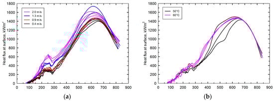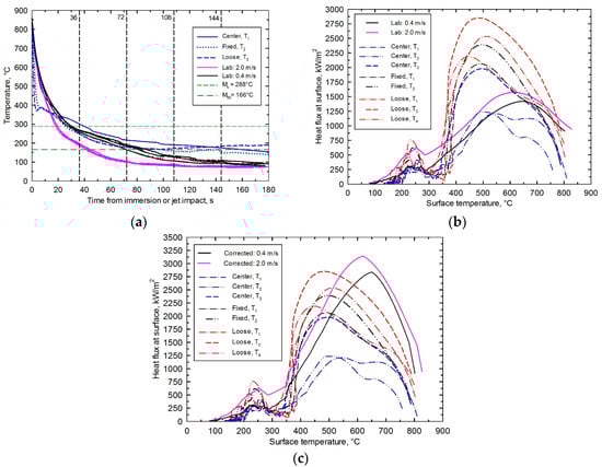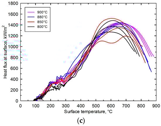 Figure 8a presents the effect of oil velocity on the boiling curves determined from laboratory tests. For each oil velocity, the average temperature evolution and its 95% confidence interval were used to compute the corresponding heat flux curves. Therefore, the figure shows an average heat flux curve together with its 95% confidence interval. The figure shows that higher heat fluxes result from higher impact velocities, as expected. The curves present some noise at temperatures below 300 °C. The reason for this is not clear, but it may be due to the evolution of latent heat during solid phase transformation that could rise the steel temperature during quenching. Figure 8b shows the effect of oil temperature on the heat flux. A significate difference between heat fluxes was found in the temperature range of 300 °C to 450 °C. The heat flux for oil at 60 °C is above the one obtained using oil at 50 °C. Presumably because oil viscosity decreases with temperature. A lower oil viscosity allows an easier growth and detachment of oil vapor bubbles from the steel surface, increasing the rate of supply of cold liquid to the hot surface []. Figure 8c shows the effect of initial steel temperature just before jet impact. It is seen that these curves have the same shape but they are shifted to the left side for lower initial temperatures. The wide confidence interval at the heat flux maxima makes it difficult to claim an effect of initial temperature over maximum heat flux; however, in the temperature range of 200 °C to 300 °C, a lower heat flux is associated to samples with a lower initial temperature, as expected.