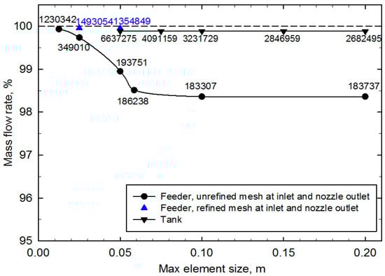 The sensitivity of the total mass flowrate with the maximum cell size and number of elements for the feeder and tank in the original case is represented in Figure 10. Mesh refining at the feeder inlet and nozzle outlets improved the accuracy to compute the mass flowrate. The feeder was discretized with a total of 1,354,849 elements to obtain mesh-independent results. Mesh quality is given by an average skewness of 0.228 with a standard deviation of 0.119. Figure 10 shows that the tank results were all mesh-independent. This subdomain was divided into a total of 6,637,275 elements, which have an average skewness of 0.211 and standard deviation of 0.128. Finally, the third sub-domain includes the 5 virtual boxes. Each one was discretized with 3,434,308 elements having an average skewness of 0.230 and standard deviation of 0.123.