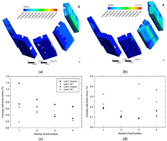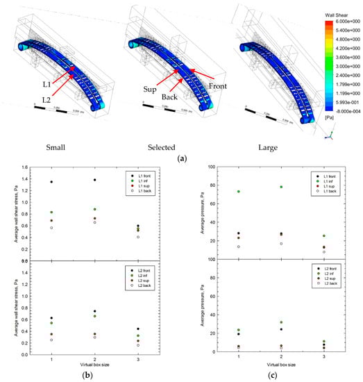 Figure 11b,c are plots of the average wall shear stress and pressure, respectively. The averages were taken over each of four leaf faces. These plots confirm the agreement between the results obtained with small and selected boxes. The faces of the selected box size are close enough to the leaf surface to properly transmit the oil velocity information to this surface, and are also far enough from the leaf body to include a better representation of the tools that hold it.