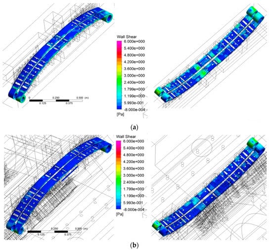 Figure 12a–d show a comparison between the results obtained with the “cascade” and full system methods. Figure 12a represents the shear stress distribution computed using the “cascade” method at the surface of the leaf springs at carousel position number 1, and Figure 12b shows the corresponding results but using the full domain calculations. In both cases, the wall shear is larger at the spring eyes because the oil flows freely there. In addition, a shadow effect in the wall shear distribution is present. This is a result of directional flow passing through the leaf springs. Figure 12c,d show the wall shear stress element frequency obtained with the full domain and “cascade” methods for first and second carousel positions. In these plots, the frequency represents the number of volume elements which wall shear is within one class number. Each class number is equivalent to 0.01 Pa. These figures show that there is a fair agreement between “cascade” and full solutions. The “cascade” solution was sensitive enough to recreate the response of the shear stress distribution to both, leaf and carousel positions. The analysis presented in this paper was obtained using the “cascade” method.