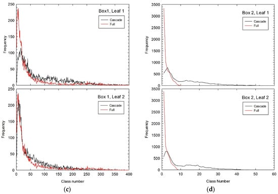 Computed wall shear stress maps on the leaf spring surfaces for the first carousel position in the original quench system using (a) “cascade” and (b) full system methods. Comparison of wall shear stress cell frequency for (c) first carousel position, box 1 and (d) second carousel position, box 2. One class number is equivalent to 0.01 Pa.