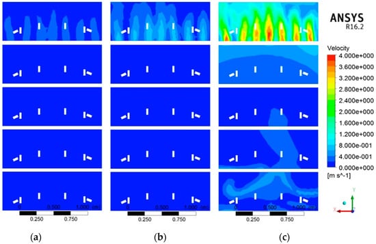 Computed velocity maps at frontal face areas of virtual boxes. Original system operating at inlet oil velocity of (a) 0.5 m/s, (b) 1 m/s and (c) 5 m/s.