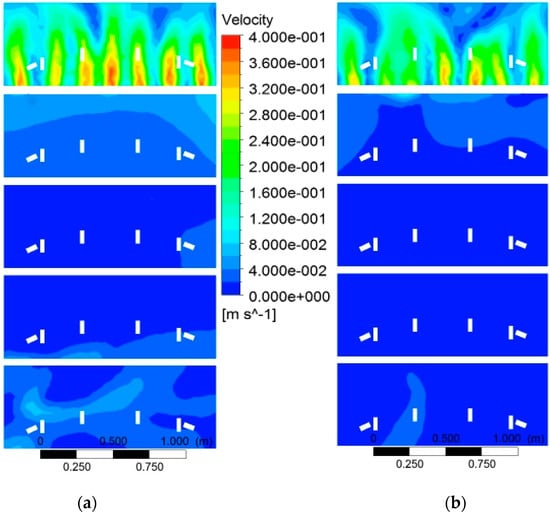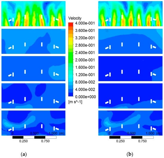 Computed velocity maps at frontal face areas of virtual boxes. (a) Original case and (b) Tank with shortened depth. Inlet oil velocity was 0.5 m/s.