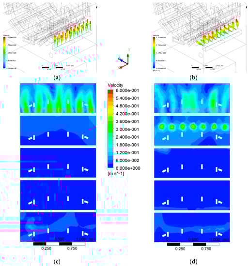 Computed oil velocity distribution at nozzle exit for: (a) Original case, (b) nozzle rows at 90° between them. Computed velocity maps at frontal face areas of virtual boxes for (c) Original case, (d) nozzle rows at 90°.