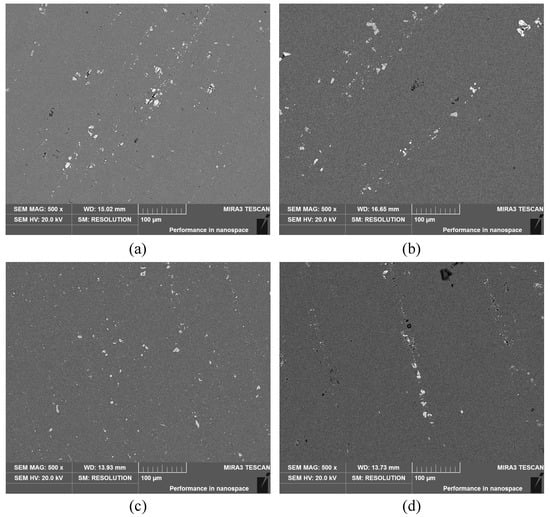 The distributions and the appearances of the large phases of the 7075 aluminum alloy, solution treated at 480 °C and for different times (0.5 h, 1.0 h, 1.5 h, and 2.0 h), are listed in Figure 3. In the dark grey Al-base, there are a large number of undissolved large-phase particles distributed along the rolling direction, which are mostly grey and black, and non-uniform in distribution and size. Some of the particles are broken in the rolling process, and separated from the Al base due to plastic deformation.