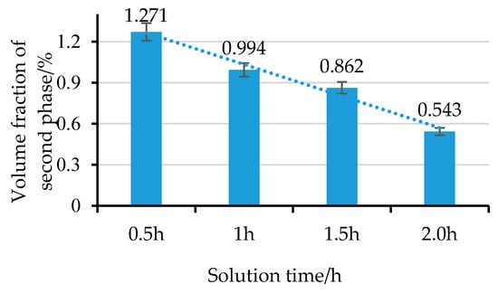 In order to quantitatively express the effects of the solution time on the large second phase, the number and average size of the large second phases were measured and calculated by Image J software (Version 1.49, National Institutes of Health, Bethesda, MD, USA, 2015). Figure 5 shows the volume fraction of the large second phase with different solution times.