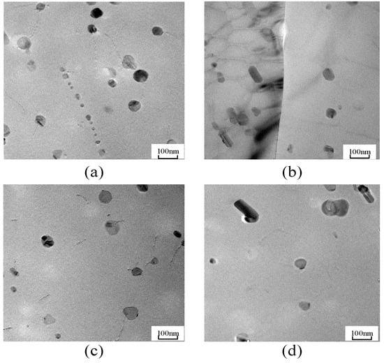 Figure 6 shows the results of the precipitated phases using TEM analysis of the 7075 aluminum alloy, that were solution treated with different times (0.5 h, 1.0 h, 1.5 h, and 2.0 h). After solution treatment, the dislocations in the base vanish in every picture. In Figure 6b, most of the precipitated phases dissolve in the base, and only a few second phases are left in the grains. With the increase of the solution treatment time, the density of the second phase decreases.