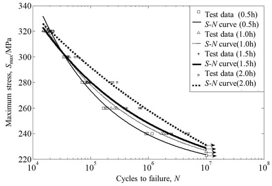 In order to obtain the S-N curves of the 7075 aluminum alloy, the Weibull equation (Equation (1)) is used to fit the data: