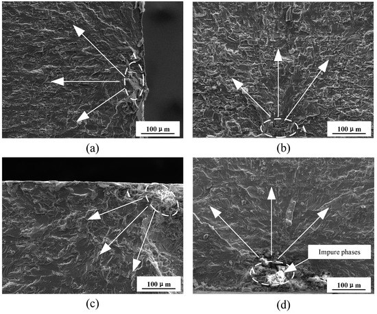 Figure 10 shows the SEM morphologies of the fatigue crack initiation region. The fatigue cracks in Figure 10a–c all initiate near the surfaces of the samples. The initiation of the cracks is the result of local shear stress. Under the cyclic loads, small slip bands are generated due to the dislocation movement of the alloy surface, and hence the initiation of the cracks in the slip band occurs. In Figure 10d, the cracks stem from the impure phases close to the alloy surface. Studies show that the large remaining phases in the 7075 aluminum alloy are mainly made up of undissolved T phases, S phases, Fe-rich phases, and Si-rich phases. The fatigue cyclic loads make dislocations slip to impure phases and pile up, and stress concentration is thus formed. When the stress is larger than the fracture strength and bonding strength with the base, the impure phases will be broken or separated from the bonding phases with the base, hence forming the cracks. Figure 10 also shows that the radial lines are centered around the fatigue initiation area (A). This is because in the process of expansion, the crack front is deviated in the direction of expansion due to the difference resistance, so that the crack begins to expand along a series of planes with a height difference, and the different fracture surfaces intersect to form a step. These steps constitute the characteristic morphology of the radial lines on the fatigue fracture.