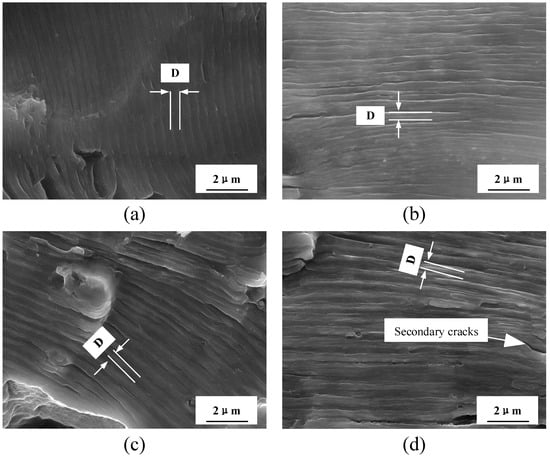 SEM morphologies of fatigue crack propagation (first stage) of the 7075 aluminum alloy under applied stresses of 260 MPa and solution times of (a) 0.5 h; (b) 1.0 h; (c) 1.5 h; (d) 2.0 h.