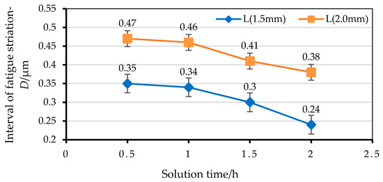 Intervals of fatigue striation—D in locations L = 1.5 mm/2.0 mm with different solution times.