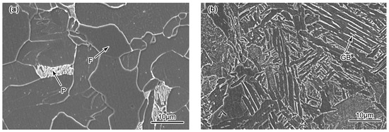 The SEM images of Q315NS steel and simulated welding HAZ are shown in Figure 1. Besides, the average grain size and hardness values of the various zones are as shown in Figure 2. The BM of Q315NS steel exhibits a typical microstructure of polygonal ferrite (F) and pearlite (P) as shown in Figure 1a. The final microstructure of the HAZ is largely determined by the applied thermal cycle. In the CGHAZ as shown in Figure 1b, a granular bainite (GB) with coarse primary austenite grain boundaries were observed. GB consisted of bainitic ferrite matrix and the martensite/austenite (M/A) phase as the second phase [25]. The M/A islands were systematically arranged between the bainitic ferrites and accompanied by surface relief effect. This structure formed because the carbon quickly diffused away from the ferrite/austenite interface as compared to the upper bainite, and there was no simultaneous formation of interlath cementite [26]. Carbonenriched austenite regions are formed by rejecting of carbon from ferrite to austenite following the transformation of bainite ferrite. With further cooling down to room temperature, the retained austenite may completely or partially transform to martensite. The content of martensite naturally depends upon the content of carbon and the other alloying elements in the austenite and the cooling rate. The M/A phases exhibiting beam-like or granular morphology were parallel to each other in the prior-austenite grains. Both FGHAZ and ICHAZ consist of ferrite and pearlite. During heating of FGHAZ and ICHAZ, austenitizing occurred when the temperature reached above Ac1. Then the austenite was transformed to ferrite (F) and pearlite (P), which resulted in the microstructure of FGHAZ and ICHAZ as shown in Figure 1c,d, respectively.