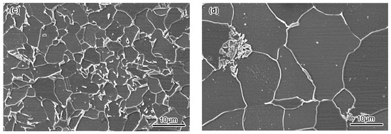 where D0 is the initial diffusion rate (6.2 × 10−7 m2∙s−1), Q is the diffusion activation energy (80 kJ∙mol−1), R is the ideal gas constant (8.31 J∙mol−1∙K−1) and T is the absolute temperature. As a result, the CGHAZ with the highest peak temperature had the largest diffusion rate. The CGHAZ had the largest grain size as shown in Figure 1. The grain of FGHAZ was even refined due to fast cooling rate when austenite transformed to ferrite and pearlite.