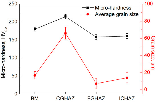 In addition, the micro-hardness of CGHAZ was the highest which was the result of the existence of GB. The grain size and micro-hardness of BM, FGHAZ and ICHAZ were at the same level.