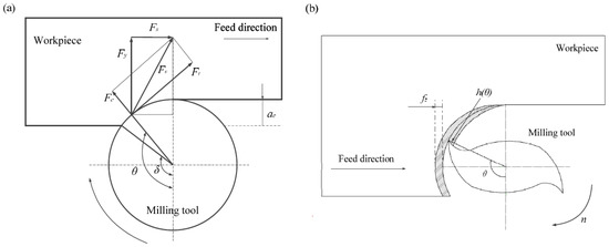 However, during down-milling experiments with straight cutting edges mills, the uncut chip thickness and cutting forces both change with the immersion angle θ, as shown in Figure 3b. As the maximum chip thickness was measured and considered in the following force modeling, the cutting forces should be calculated as follow: