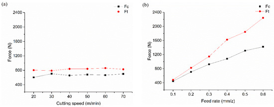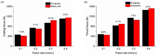 Comparison between the predicted and measured forces at varying feed rate (vc = 40 m/min, ap = 3 mm): (a) cutting force; and (b) thrust force.