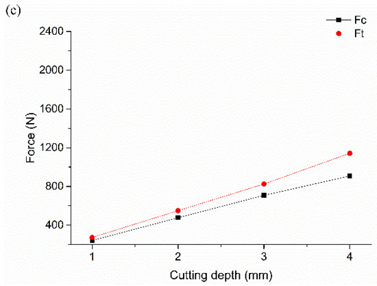 Figure 9 shows the comparison results between predicted and measured forces under varying cutting depths. It is obvious that the cutting forces increase as the cutting depth increases, and that the increasing rate of cutting force is slightly larger than that of the thrust force under different cutting depths. Additionally, the predicted force results of analytical force model show a same trend with measured forces with an error of less than 9%, which shows an excellent quantitative agreement with the analytical force model developed before.