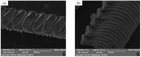 Meanwhile, it is obvious that the feed rate has the highest influence on cutting forces followed by cutting depth and speed. With an increase in the feed rate or cutting depth, the cutting forces increase linearly. This may be due to the increase of the cutting area and removed material volume as the feed rate or cutting depth increased. Additionally, in low-speed cutting (the spindle speed is around 1857 r/min as the cutting speed equals 70 m/min), the cutting speed does not significantly influence the cutting forces, as shown in Figure 4a. The presence of hard particles resulted in the highly brittle nature of in situ TiB2/7050Al composites, which can be seen from the common formed saw-teeth chips at low cutting speed, as shown in Figure 5. Thus, with using PCD tools, the friction at the chip-tool interface was small, resulting in little fluctuation of the cutting force as the cutting speed increased.