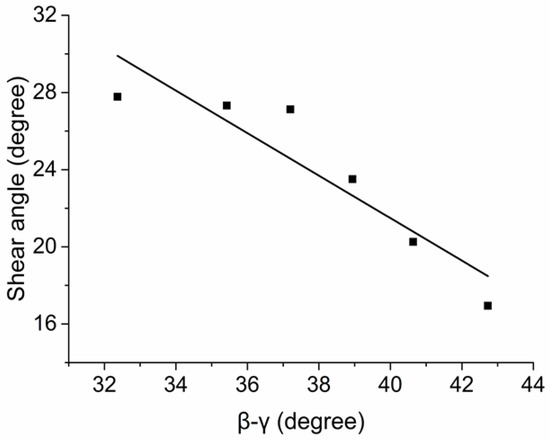 However, whether the relationship in Equation (11) is still suitable for cutting in situ TiB2/7050Al composites is unknown and needs further study. During orthogonal cutting of in situ TiB2/Al composites, as discussed in Section 3, it is obvious that the feed rate plays an important role on cutting forces. Then the relationship between shear angle φ and (β − γ) at varying feed rate is shown in Figure 8.