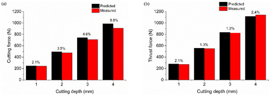 Comparison between the predicted and measured forces at varying cutting depth (vc = 40 m/min, fz = 0.2 mm/z): (a) cutting force; and (b) thrust force.