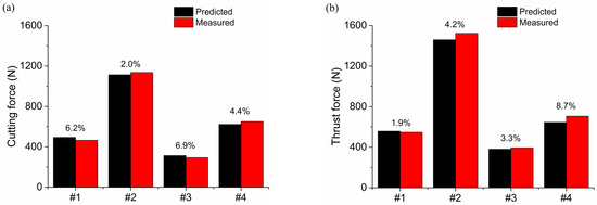 Comparison between the predicted and measured forces under different combination of cutting parameters: (a) cutting force; and (b) thrust force; (#1) vc = 20 m/min, fz = 0.2 mm/z, ap = 2 mm; (#2) vc = 30 m/min, fz = 0.4 mm/z, ap = 3 mm; (#3) vc = 40 m/min, fz = 0.3 mm/z, ap = 1 mm; (#4) vc = 50 m/min, fz = 0.1 mm/z, ap = 4 mm.