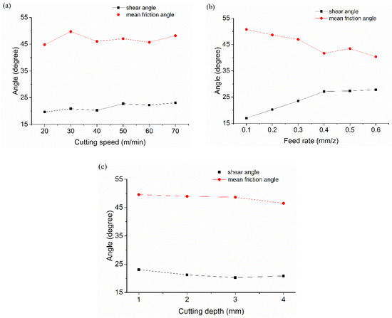 Effect of cutting parameters on shear and mean friction angle: (a) cutting speed; (b) feed rate; and (c) cutting depth.