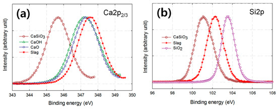 The bonding state of the elements in BFS can be an important factor when slag is dissolved in a weak acetic acid aqueous solution. The Ca–O bond is reported to be more liable to dissolve than the Ca–Si–O bond in the acid leaching of BFS [7]. In this study, XPS analysis was employed to investigate the binding state of Ca and Si using reference samples of CaSiO3, SiO2, CaOH, and CaO.
