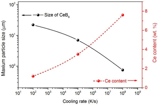 Cooling rate versus the particles size and the Ce content in the matrix.