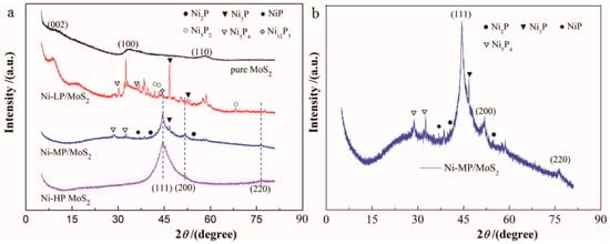X-ray diffraction (XRD) spectra of the pure MoS2 and three Ni–P/MoS2 composites: (a) pure MoS2, Ni–LP/MoS2, Ni–MP/MoS2, and Ni–HP/MoS2 composites; and (b) Ni–MP/MoS2 composite.