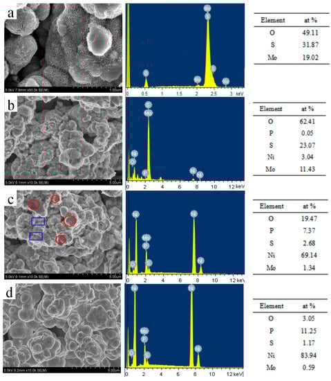 Scanning Electron Microscope (SEM) images and Energy Dispersive Spectrometry (EDS) spectra of the pure MoS2 and three Ni–P/MoS2 composites: (a) pure MoS2; (b) Ni–LP/MoS2; (c) Ni–MP/MoS2; and (d) Ni–HP/MoS2.