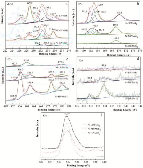 As for the Ni 2p spectrum (Figure 3c), peaks observed at 852.9 eV (Ni–LP/MoS2 and Ni–MP/MoS2) and 852.7 eV (Ni–HP/MoS2) are corresponding to the fcc Ni. For samples of Ni–MP/MoS2 and Ni–HP/MoS2, the peak at 856.3 eV can be attributed to the oxidized Ni species with a 2+ oxidation state. The peaks with binding energy of 859.8 eV (Ni–LP/MoS2), 861.7 eV (Ni–MP/MoS2), and 861.9 eV (Ni–HP/MoS2) can be ascribed to the satellite of the Ni 2p3/2 line [26,27]. Meanwhile, peaks at 873.7 eV (Ni–MP/MoS2) and 873.8 eV (Ni–HP/MoS2) can be assigned to oxidized Ni species. Peaks at 879.4 eV for Ni–LP/MoS2 (879.8 eV for Ni–MP/MoS2, and 880.0 eV for Ni–HP/MoS2) are corresponding to the satellite of the Ni 2p1/2 line [26,27]. For the P 2p spectrum (Figure 3d), the presence of peak at 128.4 eV for both Ni–LP/MoS2 and Ni–MP/MoS2 composites represents the formation of phosphide [32]; another peak appearing at 133.4 eV for all three Ni–P/MoS2 composites suggests the formation of phosphate [33]. Finally, for the three composites, only one peak at 531.7 eV in correlation to the O 1s can be observed (Figure 3e), indicating the bond formation of Mo(IV)–O [15] because of the oxidation.