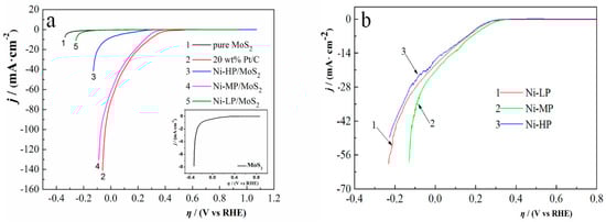 Linear sweep voltammetry (LSV) curves of the samples: (a) pure MoS2, 20 wt % Pt/C, Ni–LP/MoS2, Ni–MP/MoS2, and Ni–HP/MoS2. Scan rate: 2 mV/s, potential window: −0.3~0.8 V (vs. RHE); (b) Ni–LP, Ni–MP, and Ni–HP. Scan rate: 2 mV/s, potential window: −0.4~0.8 V (vs. RHE).