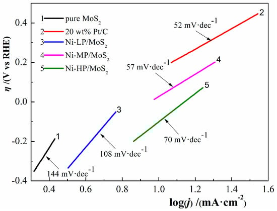 Tafel plots of the pure MoS2, 20 wt % Pt/C, Ni–LP/MoS2, Ni–MP/MoS2, and Ni–HP/MoS2. Scan rate: 10 mV/s, potential window: 0.3~1.6 V (vs. RHE).