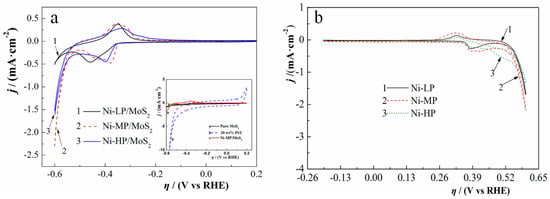 Cyclic voltammetry (CV) curves of the samples: (a) pure MoS2, 20 wt % Pt/C, Ni–LP/MoS2, Ni–MP/MoS2, and Ni–HP/MoS2. Scan rate: 10 mV/s, potential window: –0.6~0.2 V (vs. RHE); (b) Ni–LP, Ni–MP, and Ni–HP. Scan rate: 20 mV/s, potential window: −0.25~0.6 V (vs. RHE).