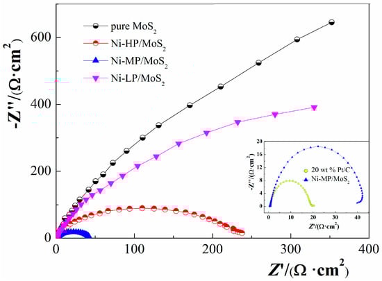 Electrochemical impedance spectroscopy (EIS) curves of the pure MoS2, 20 wt % Pt/C, Ni–LP/MoS2, Ni–MP/MoS2, Ni–HP/MoS2. Cathodic overpotential: 0.7 V (vs. RHE), frequency: 100 KHz–10 mHz, amplitude of the sinusoidal signal: 5 mV.