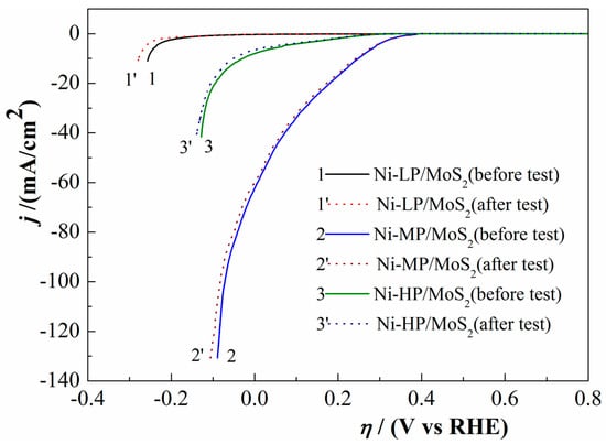 Stability tests for Ni–LP/MoS2, Ni–MP/MoS2, and Ni–HP/MoS2 composites. Scan rate: 50 mV/s; potential window: −0.3 and 0.8 V (vs. RHE).