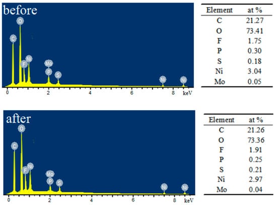 EDS spectra of the Ni–MP/MoS2 composite before and after the stability test.