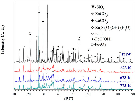 The complicated zinc ore received from Yunnan province of China, was crushed and ground to a powder of size less than 75 μm, and its chemical composition is recorded in Table 1. The X-ray diffraction (XRD, Rigaku, Japan) pattern of the zinc residue shows the mineralogical content of the sample before and after roasting at various temperatures is shown in Figure 1. It can be seen that XRD analysis shows the smithsonite (ZnCO3), hemimorphite (Zn4Si2O7(OH)2·H2O), and gangue, such as calcite (CaCO3) and quartz (SiO2). All the chemical reagents used in this study were of analytical grade.