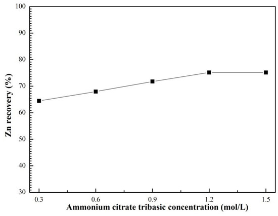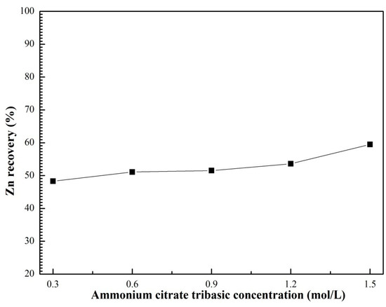 Effects of different ammonium citrate concentrations (from 0.3 to 1.5 mol/L) on leaching efficiency of zinc from the unroasted ores.