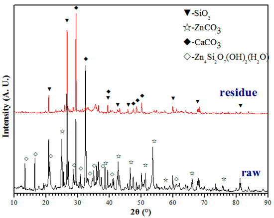 XRD patterns of the complicated zinc ores before raw ore and the residue after the raw ore leached at the same condition.