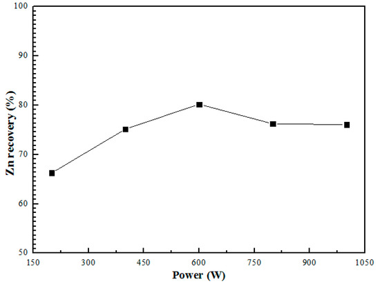 Figure 7 shows the effect of the ultrasonic power on the % Zn recovery covering an ultrasonic power range of 200 to 1000 W. The figure shows the maximum recovery is observed at an ultrasonic power of 600 W, while beyond that it was found to decrease. The increase in the % Zn recovery with an increase in the ultrasonic power can be attributed to the increase in the cavitation effect, the mechanical stirring effect, which increased the degree of turbulence in the solid-liquid interface that contributed to a higher recovery. In addition, the micro-jet generated by the cavitation of the ultrasonic wave will promote the diffusion of the leachant to the surface of the mineral, liberating the zinc ions. At ultrasonic powers in excess of 600 W, a marginal decrease in the Zn recovery could be attributed to the ultrasonic power contributing to the volatilization of ammonia and the decomposition of ammonium chloride in the leaching system. The reduction of ammonium ions in the leaching solution inevitably contributed to a reduction in the Zn recovery. This phenomenon is also reported by Li et al. [18].