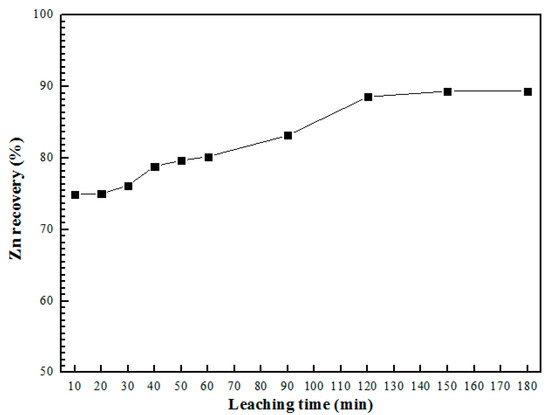 The influence of the leaching duration on the Zn recovery is presented in Figure 8. With increases to the leaching duration, an increase in the Zn recovery was observed, the maximum Zn leaching was 88.57% for a duration of 120 min.