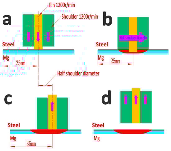 The diagram of new keyholeless spot welding: (a) The start of welding; (b) the welding process with the retraction of the pin; (c) the finished retraction; and (d) the end of welding.
