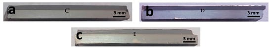 Figure 7 shows VDW joints of the combination of three materials. Owing to having no bonding strength between Mg99.50 and non-zinc-coated DP600, the joint had separated in the cutting of the metallographic samples. Therefore, the weld morphology was not listed in Figure 6. As shown in label A of Figure 6, and C, D, and E of the Figure 7, the interface of Mg/steel was smooth and there is no deformation. The interface of Mg/steel only depended on the solid phase diffusion mechanism to form the effective bonding.
