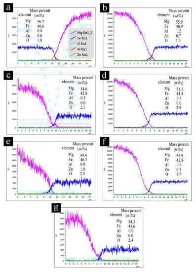 It can be concluded that the Mg/steel surface in FSKSW and VDW mainly contains Mg, Fe, Al, Zn, and O. These five elements, with the spectral line of Mg and Fe, interacted each other. The result means that Mg and Fe barely have any solid solubility. However, no matter the kinds of joints, all joint regions have the situation that Mg and Fe in the bonding interface diffuse mutually during the welding process. Additionally, we can obviously figure out in Figure 8a–g that the spectral line’s staggered width of Mg and Fe is around 2 μm, meaning that although the method of welding is different, the extent of diffusion in Mg and Fe had no difference and the percentage of the joint regions had little distinction. The content of trace elements, such as Zn, Al, and coated metal, are low, which is not obvious in the spectral line and indicated in the percentage of contents in the joint zone. As is shown in Figure 8c,d, as for DP600 the zinc layer has been polished away and the content of Zn in AZ31B is rather low, Zn can hardly be detected. As no Al can be detected in Mg99.50 and DP600, the mass percent of Al in Figure 8e–g is zero. O can be detected in both samples owing to the oxidation of Mg in the process of making samples. The zinc layer thickness of DP600 is about 15–20 μm and, according to theory, it should be found that relatively higher content of Zn exists in DP600 joints. However, owing to the high temperature leading to the evaporation loss of Zn, the content of Zn is relatively lower in joints. Since Mg99.50/non-zinc-coated DP600 has no bonding strength, meaning samples cannot be made, so there is no picture to analyze.